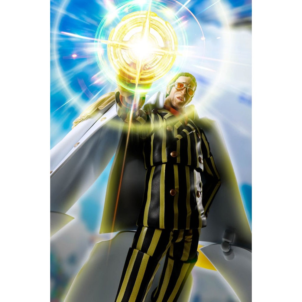 Borsalino Actionfigur in der Future Island Egghead Version aus One Piece. Die Figur stammt aus Tamashii Nations ´S.H. Figuarts´-Reihe, ist sehr detailliert, voll beweglich und wird mit viel Zubehör in einer Fensterbox geliefert.